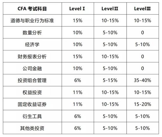 CFA考试共三个等级,涉及以下10个科目,涵盖了金融投资领域所需的核心金融理论知识和金融行业实务操作能力,对于培养一个学生完备的金融知识理论基础和金融思维逻辑具有极大的优势。