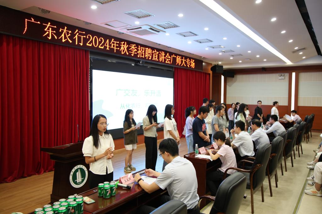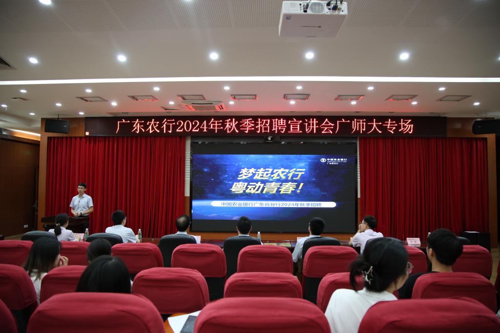 农行广州分行人力资源部高级人力资源管理曹庭恺介绍了农行省分行的企业背景、人员规模、制度建设、社会责任、培养模式和薪资结构,并就讲解分析秋季招聘的重要时间节点、申请流程、对网申的注意事项予以指导。曹庭恺表示,农行省分行,历来重视广师大毕业生,这是他第四次带领招聘团队来校宣讲,希望广师大学子能来农行的平台发光发热,实现人生的理想和抱负。从化支行综合管理部副经理叶梓毅以“广交友,乐升活”介绍从化农行地域、交通、人际、环境、晋升、资源等情况,从乡村振兴示范区、国家城乡融合发展试验区和打造粤港澳大湾区创新试点等具体项目向同学们展示了从化农行的发展规划,并欢迎同学们报考从化农行。