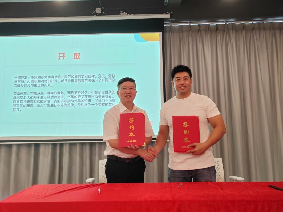 随后,我院副院长刘国庆、电子商务专业负责人辛娜等一行人前往盈桔数字视听直播产业园,产业园负责人荣晋国介绍了盈桔产业园的项目定位、业态规划、运营理念等内容。双方就校企合作,共同促进教育与产业融合进行深度交谈,最后,刘国庆副院长与荣晋国总经理就我院商务系电子商务专业实习基地举行了签约仪式。