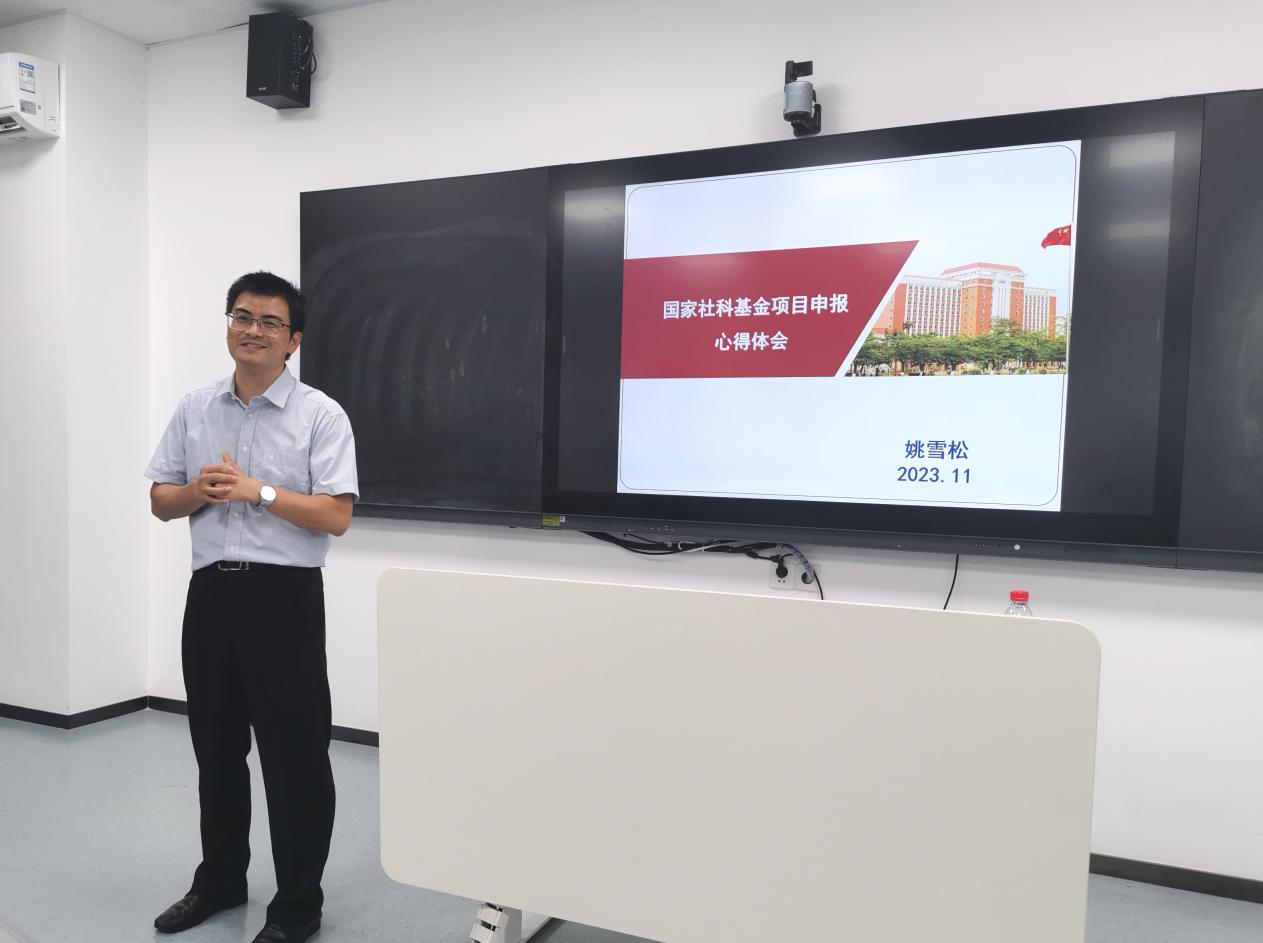 姚雪松副教授分享了2022年获得国家社科基金一般项目的申报心得体会。从申报书的研究现状、学术价值和应用价值、重点难点、可行性、创新之处、预期成果等各方面阐述自己的申报建议,并向各位老师分享了申报书中的相关注意事项和细节。在随后的点评中,陈平副教授感谢姚雪松老师的报告使他获益良多,并分享了他此次的学习体会和认真总结,认为学术论坛的开设非常有意义。