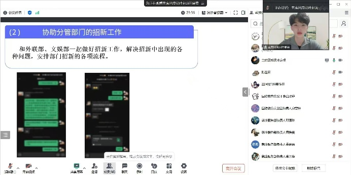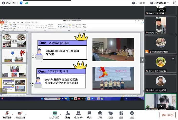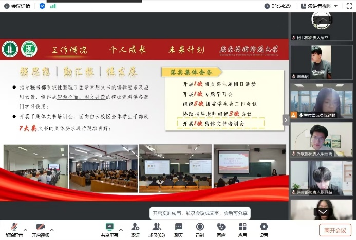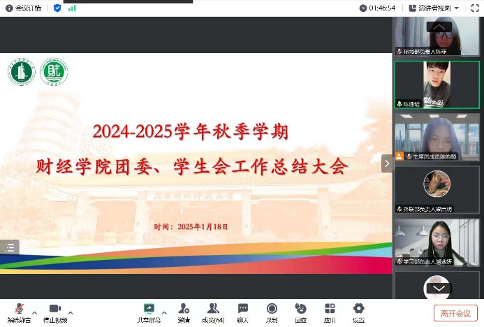 2025年1月18日晚,我院团委、学生会2024年秋季学期工作总结大会如期在线上召开,本次会议旨在回顾反思各部门本学期的工作开展情况及成效,并提出下学期的工作计划及展望。我院学生会指导老师陈逸珺、团委副书记、学生会主席团成员、各部门负责人及工作人员代表出席会议,主席团成员陈韵颐主持会议。
