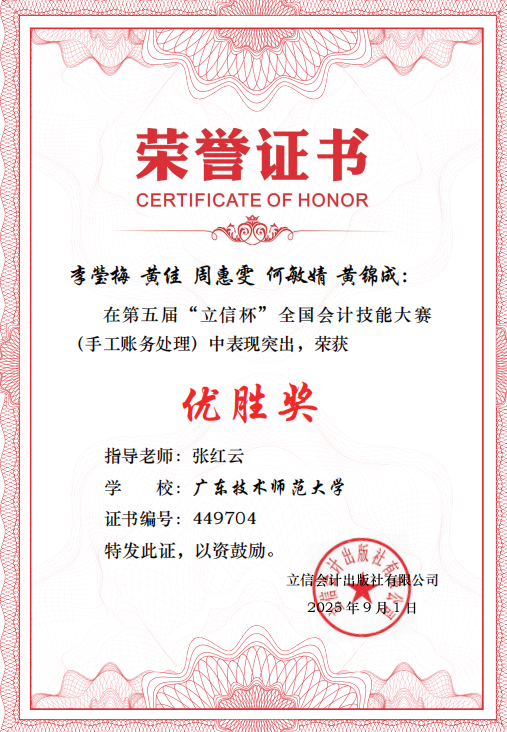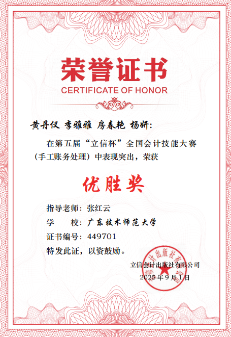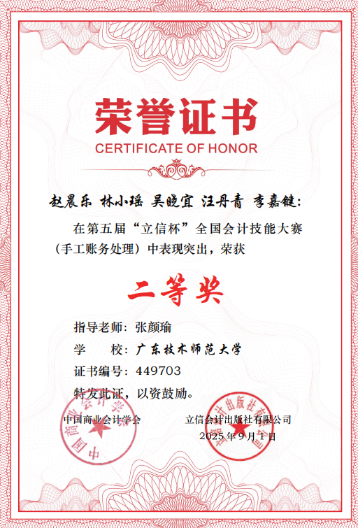 近日,由中国商业会计学会主办的第五届“立信杯”全国会计技能大赛(手工账务处理)全国总决赛获奖名单正式公布。我院五支参赛队伍的参赛作品全部获奖,分别荣获一等奖1项、二等奖1项、优胜奖3项,充分展现了财经学院在会计实践教学方面的显著成效。