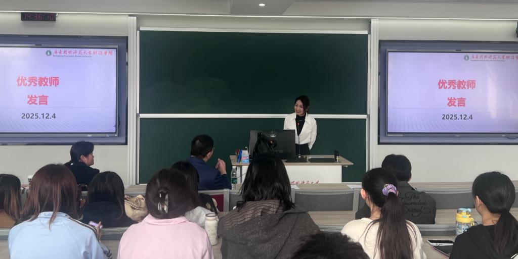 随后是优秀校友及优秀教师代表麦黛洁老师发言。麦老师结合自身职场经历,生动讲述了数智化技能如何为职业发展赋能,为学弟学妹们提供了宝贵的经验参照。她赞扬学员们展现出的积极探索精神和团队协作能力,并勉励大家“毕业不是学习的终点,而是终身学习的新起点”,希望同学们持续关注行业前沿,将理论知识与复杂商业场景相结合,成为卓越的会计人才。